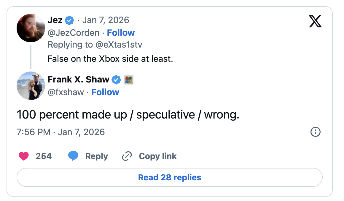 Windows Central editor Jez Corden moved quickly to dispute the report, stating that the information was false with respect to Xbox. Shortly after, Microsoft’s chief communications officer, Frank X. Shaw, weighed in to dismiss the claims more broadly. Shaw, who has been with Microsoft for nearly 17 years, wrote on social media that he “eagerly awaits” the news he insists does not exist, reinforcing his view that the report was baseless.